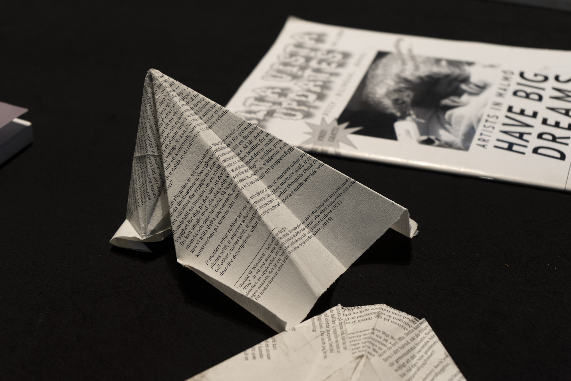 Allt Kött Är Hö, är ett förslag på ett sätt att möta världen och att se på konst: Betrakta allting som materiellt inklusive dig själv. Se allting som besjälat liksom dig själv. Iaktta noga vad som är något, tänk på vad det är inte dess beståndsdelar inte dess relationer men vad det är i sig självt, som en helhet; ett objekt. Francis Patrick Bradys text är ett objekt i sig själv som knyter ihop historia och material. Den fungerar samtidigt som ett verk i utställningen och en ingång till de texter och den teori som är knuten till utställningen. ”Gummistövlar och ett pappersflygplan”talar om rörelse på skilda sätt, och den sätter samtidigt arbetet med en kollaborativ bokversion av Allt Kött Är Hö i rörelse.